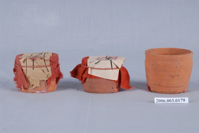 本組藏魂罐共有三件,兩件以紅布束口並貼有符令者罐身較短,另一件罐身較長,沒有束紅布。三只罐皆為磚胎陶製,圓口直筒,開口直徑較底部稍大,未上釉而保持胎體之磚紅原色。其中兩只為使用中狀態,罐口以紅色棉繩束紅布,上方貼一道蓋有法印的符令。