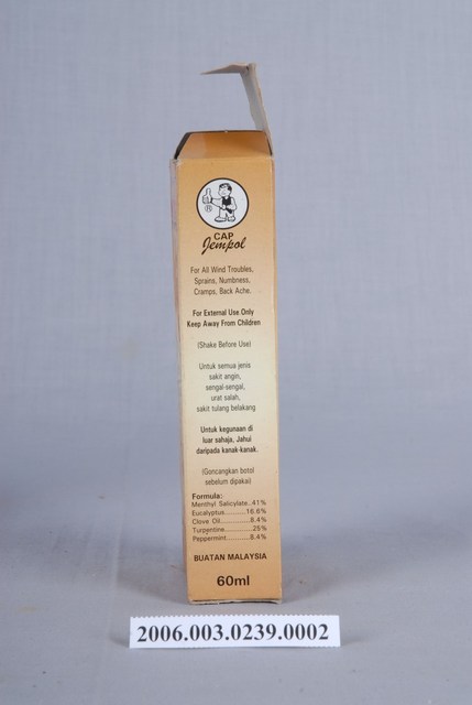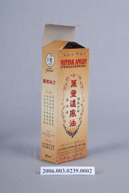 本物件為萬里追風油紙盒。紙盒前後面圖文相同,印有萬里追風油藥、MINYAK ANGIN、PENGGOSOKAN、腰酸背痛和風濕痛字樣,以及製造商資訊。一側面印有成分,以及英文的和馬來文的使用方法和主治效能。另一側面印有中文的使用方法和主治效能。