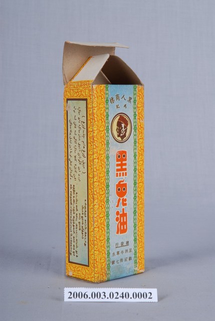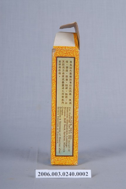 本物件為黑鬼油紙盒。紙盒前後面圖文相同,印有黑人商標、黑鬼油和總發行星洲牛車水戲院街門牌7號字樣。一側面印有中英文的藥品說明,主治效能例有肌肉痛、風濕痛、腰痛和損傷等。另一面為淡米爾文和爪夷文說明。