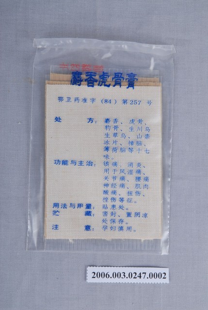 本物件為麝香虎骨膏貼布。每包塑膠袋中有4片貼布。塑膠袋一面印有麝香虎骨膏和武漢市健民製藥廠字樣,另一面印有成分和主治效能等內容。