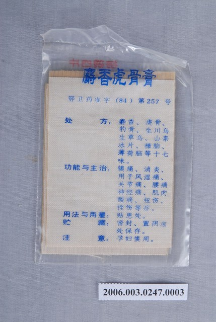 本物件為麝香虎骨膏貼布。每包塑膠袋中有4片貼布。塑膠袋一面印有麝香虎骨膏和武漢市健民製藥廠字樣,另一面印有成分和主治效能等內容。
