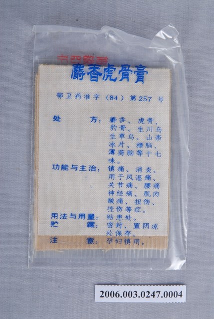 本物件為麝香虎骨膏貼布。每包塑膠袋中有4片貼布。塑膠袋一面印有麝香虎骨膏和武漢市健民製藥廠字樣,另一面印有成分和主治效能等內容。