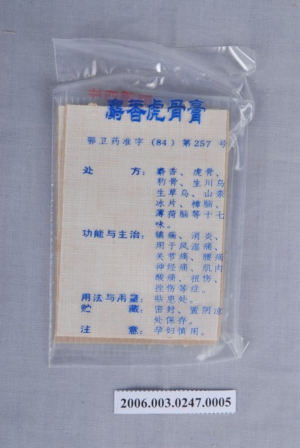 本物件為麝香虎骨膏貼布。每包塑膠袋中有4片貼布。塑膠袋一面印有麝香虎骨膏和武漢市健民製藥廠字樣,另一面印有成分和主治效能等內容。