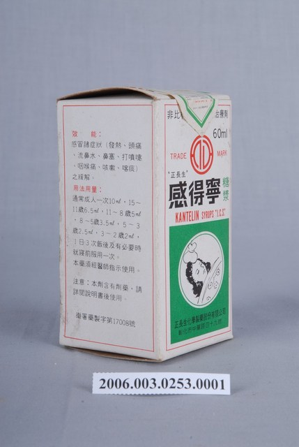 1. 本物品為正長生感得寧糖漿藥盒。藥盒印有一女性躺臥,頭部放有冰袋之圖片,與衛署藥製字第17008號字樣,另有藥品名、製藥廠資訊、用法用量和效能等內容。效能有感冒、頭痛、發熱和流鼻水等。