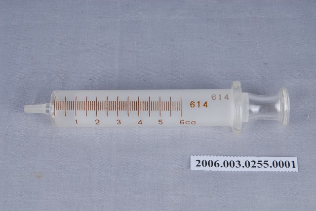 本物件為玻璃注射筒。注射筒上有刻度,共分成30格,每10格有數字,分別是1、2、3、4和5,單位為cc。針筒上另有614、Columbia和NF字樣。