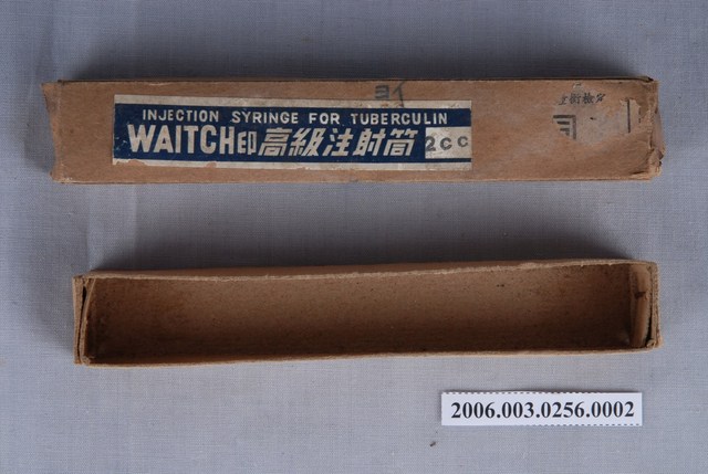 本物件為WAITCH印高級注射筒包裝盒。包裝盒為紙製品,有蓋。盒蓋貼有標籤紙,印有WAITCH印高級注射筒、2cc和INJECTION SYRINGE FOR TUBERCULIN字樣。