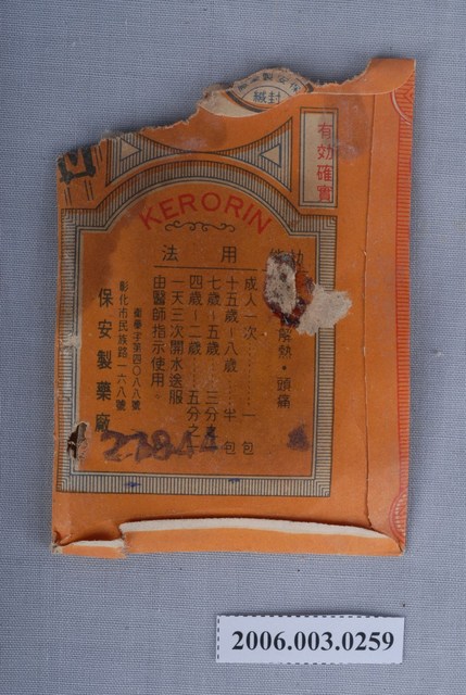 1. 本物件為保安經呂霖散。封面為橘色色調,其上印有兩人頭像,一人頭痛,一人齒痛,以及齒痛頭痛新藥、保安經呂霖散等字樣和主要成分。背面印有用法和效能,有解熱和頭痛,另有藥衛字第4088號字樣。