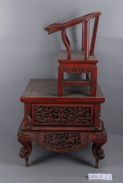 本件西羅殿神轎為無轎頂的武轎形式,由底座、座椅、案桌等三個部份組合而成,可以拆卸,以木作雕刻裝飾,雕工精緻,施有單一朱紅色漆。神轎在底部作一方前後較長的臺基,基腿四腳做「獅吞」雕刻,四邊則作透雕雙龍搶珠、雙龍拜塔裝飾。臺基之上在前方置一張長方形案桌,正面桌堵雕刻正面蟠龍紋及四名持武器之人物,兩側及下方圍繞水族動物及纏枝花卉,上方橫楣雕有八仙中的四位,其間在圓形花框內雕「西羅殿」三字,西羅殿為臺南府城主祀廣澤尊王之古廟。臺基後半段置一張束腰方桌,桌腳雕「獅吞」,腳部之間作交戰人物透雕,方桌腰部面堵亦為交戰圖透雕裝飾,後方一堵已失,腰部兩側裝有四件方形鐵環,可供穿過轎槓。桌上置一張扶手出頭作龍頭的圈背木椅,以作為神像安奉處。