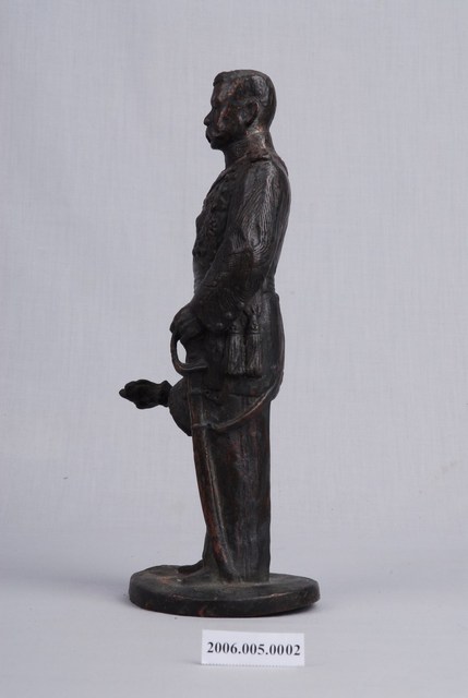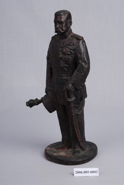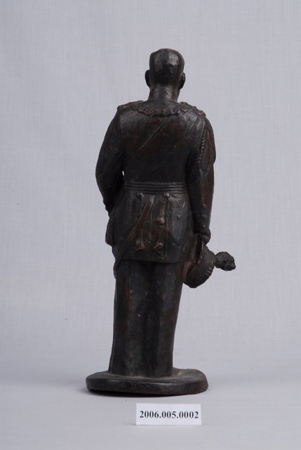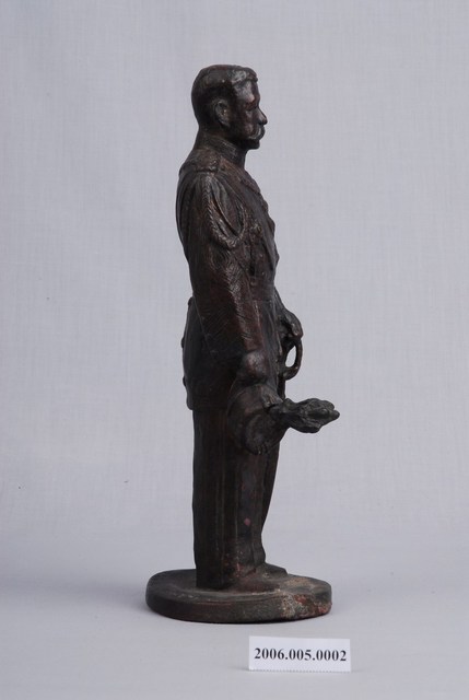 此物件為樺山資紀塑像,以金屬鑄成,人物著軍裝,脫帽站立。 此物件為樺山資紀的立像,樺山資紀為臺灣的第一任總督。樺山資紀與臺灣的淵源最早起於「牡丹社事件」,當時樺山資紀正駐防鹿兒島,積極促成派兵攻打牡丹社,他曾寫成《臺灣記事》一書紀錄此時期的事件。在甲午戰爭後,樺山積極主張日本應取得臺灣,更在之後成為臺灣首任總督,並於臺灣基隆港登陸展開為期10個月的臺灣全島軍事鎮壓,此軍事鎮壓直到1896年3月完成,但因在1896年2月回到日本的樺山與日本中央進行的臺灣統治政策的交涉不成,最終選擇離職。