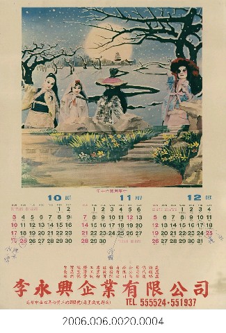 1. 李永興企業有限公司於民國60年發行的廣告月曆,直立式單面印刷,每三個月一頁,本件為10、11、12月份,頂端有戳孔痕跡。2. 本頁月曆上半部圖像呈現的為史艷文布袋戲當中的某一場景,布景為大雪紛飛的夜晚,一輪明月映照著塔樓房舍,佈滿白雪的枯樹、石橋與冰湖,這樣的場景卻顯然跟人偶前方的綠草野花互不相襯,可見是製作排版的失察;四位人偶當中右側兩位手持有武器,左側兩位赤手空拳,狀似狹路相逢的追殺氣氛。圖像左右兩側有淺藍色的裝飾花紋。頁面下半部為該年10、11、12月份的週次表,以及紅色「台灣塑膠工業股份有限公司代銷處」、「南亞塑膠工業股份有限公司代銷處」、「亞洲化學工業股份有限公司連絡處」、「李永興企業有限公司」、「高雄市塩城區七賢三路242號(壽星戲院對面)」、「TEL. 555524‧551937」等字樣。因略有年代整體呈現出明顯泛黃、沾染污漬、邊角凹折破損的現象;週次表上有多處以手寫標註待辦事項相關簡易訊息的狀況。3. 布袋戲「雲州大儒俠—史艷文」自從1970年3月在台視播出後,便受到極大的喜愛,後來甚至連演583集,創下97%的高收率。1974年6月一度停播,而後陸續有新版本在電視播出,隨著影像媒體業的發展,也有製作成錄影帶、影碟等,堪稱是當今許多4、5、6年級生記憶最深刻的布袋戲劇。