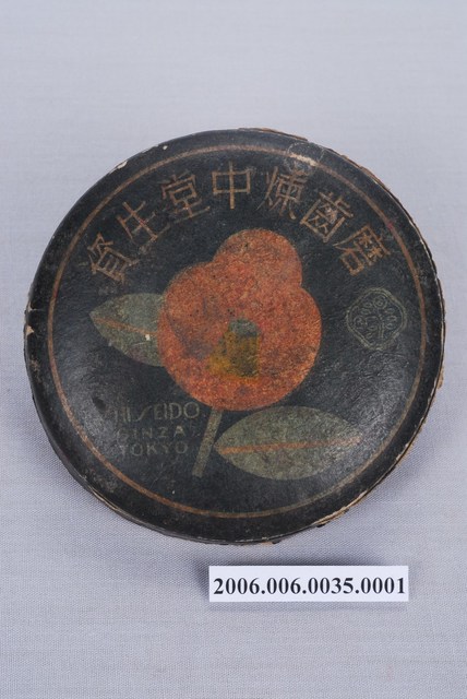 本文物為資生堂牙膏盒蓋,為黑色,正面最上方印有紅色玫瑰花配綠葉,上面寫有「資生堂中煉齒磨」的字樣及資生堂商標,左下角為資生堂英文「SHISEIDO」,及其位置「GINZA」、「TOKYO」即東京銀座。日治時期,牙膏多被視為化妝品一同販賣,使用者多以女性為主。化妝品及其附屬產品,體現社會審美觀和科技的變動,反映女性對特定生活之想像,相對地女性之美也時常受限於社會傳統價值觀。