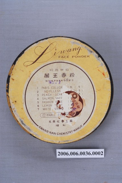 本文物為露恩(原文:Liuang)粉盒體,粉盒體為咖啡色內裏,白色外殼黑色底座的圓形扁柱體。化妝品及其附屬產品,體現社會審美觀和科技的變動,反映女性對特定生活之想像,相對地女性之美也時常受限於社會傳統價值觀。