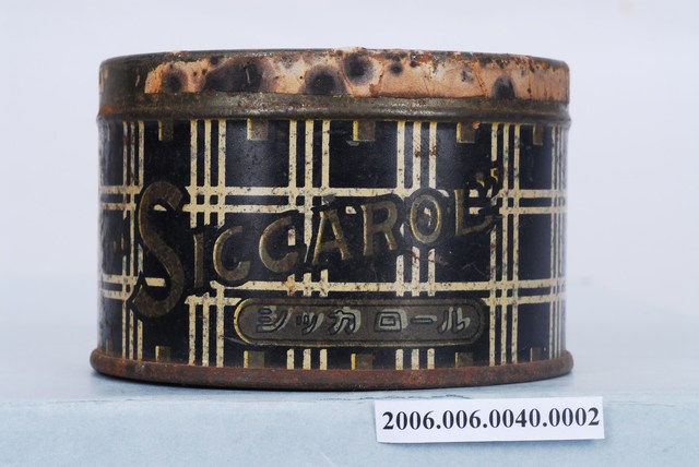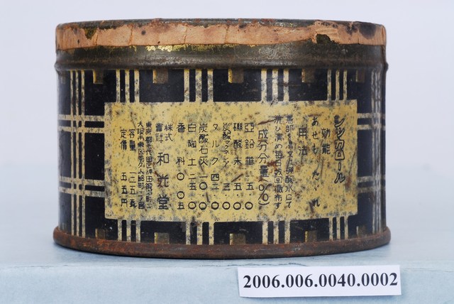 本文物和光堂爽身粉盒,整體為圓柱體,其上寫有「SICCAROL」、「シツカロール」應為該產品的品名,整體以藍白格紋為背景之。爽身粉為滑石製作,洗澡完後使用,被認為有護理皮膚、預防痱子的功效。臺灣最早的科學配方爽身粉為1906年和光堂爽身粉,與傳統的天瓜粉(天花粉)相比,成為摩登、流行的象徵。1991年開始美國隊於滑石粉的使用作了許多研究,並質疑爽身粉的滑石成分導致女性乳癌並影響生殖器及子宮隔膜,至今爽身粉的使用對女性和嬰兒的影響仍備受爭議。