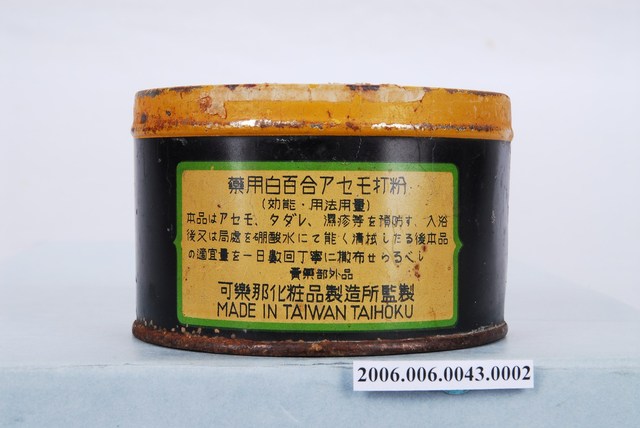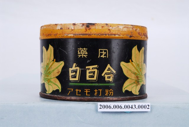 本文物為藥用白百合爽身粉盒身,整體為圓柱體,以黑色為背景,寫有該爽身粉的配方及使用方式,並標示產地為臺灣,製造商為可樂那花妝品製造所。爽身粉為滑石製作,洗澡完後使用,被認為有護理皮膚、預防痱子的功效。臺灣最早的科學配方爽身粉為1906年和光堂爽身粉,與傳統的天瓜粉(天花粉)相比,成為摩登、流行的象徵。1991年開始美國隊於滑石粉的使用作了許多研究,並質疑爽身粉的滑石成分導致女性乳癌並影響生殖器及子宮隔膜,至今爽身粉的使用對女性和嬰兒的影響仍備受爭議。