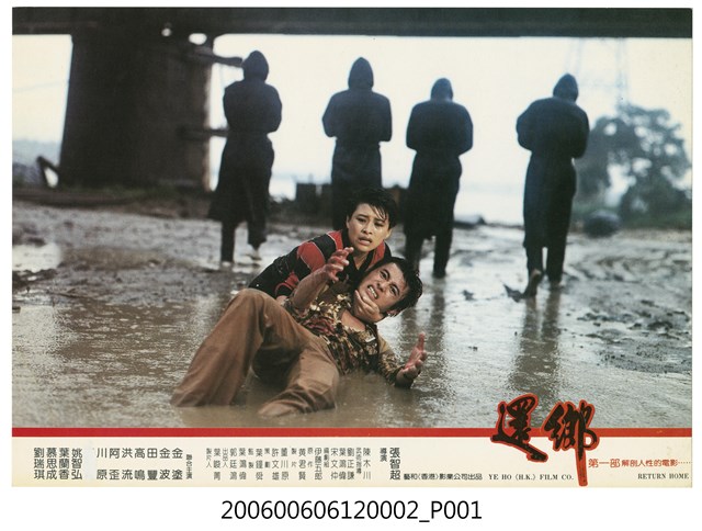1. 臺灣社會寫實片《還鄉》中文橫式彩色宣傳劇照組圖。劇照設計為下方以紅線條隔出演職員表資訊區,以紅色描邊的黑色片名標準字在右下角跨在線上,右邊有「第一部解剖人性的電影......」紅色字樣,以及英文片名。劇照採滿版設計,場景在大橋下,積水的泥土地上一名短髮女子緊張地抱住受傷的花襯衫男子,男子表情痛苦又不可思議狀,舉起流血的右手看向前方。兩人後面有四名身穿連帽風衣的男子背影以失焦畫面處理。劇照狀況良好。2. 《還鄉》為藝和(香港)影業公司於1989年出品的社會寫實片,由張智超導演,宋文仲、葉鴻偉、劉正謙編劇,陳木川武術指導,主要演員有慕思成、劉瑞琪、葉蘭香、洪流。本片由台聖公司發行的DVD將編劇誤植為呂繼尚。本片又名《街坊老角頭》。