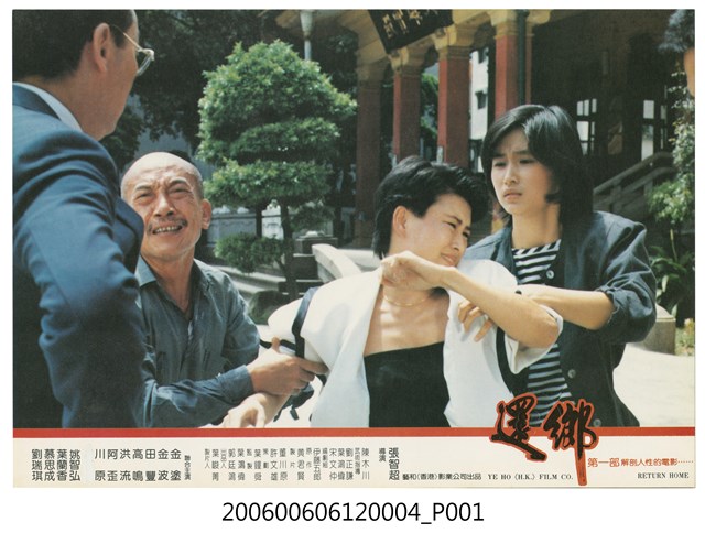 1. 臺灣社會寫實片《還鄉》中文橫式彩色宣傳劇照組圖。劇照設計為下方以紅線條隔出演職員表資訊區,以紅色描邊的黑色片名標準字在右下角跨在線上,右邊有「第一部解剖人性的電影......」紅色字樣,以及英文片名。劇照採滿版設計,場景在一佛寺的大雄寶殿外,一名白衣女子(葉蘭香)情緒激動,一名老者(洪流)與年輕女子(劉瑞琪)拉住她,前方有一穿西裝的男士(田豐)手插腰看著三人。劇照狀況良好。2. 《還鄉》為藝和(香港)影業公司於1989年出品的社會寫實片,由張智超導演,宋文仲、葉鴻偉、劉正謙編劇,陳木川武術指導,主要演員有慕思成、劉瑞琪、葉蘭香、洪流。本片由台聖公司發行的DVD將編劇誤植為呂繼尚。本片又名《街坊老角頭》。