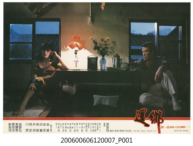 1. 臺灣社會寫實片《還鄉》中文橫式彩色宣傳劇照組圖。劇照設計為下方以紅線條隔出演職員表資訊區,以紅色描邊的黑色片名標準字在右下角跨在線上,右邊有「第一部解剖人性的電影......」紅色字樣,以及英文片名。劇照採滿版設計,場景為平房閣樓,右側男子(慕思成)隔著方矮桌與一名女子(葉蘭香)坐在榻榻米上談話。方桌上有手提式收音機。劇照狀況良好。2. 《還鄉》為藝和(香港)影業公司於1989年出品的社會寫實片,由張智超導演,宋文仲、葉鴻偉、劉正謙編劇,陳木川武術指導,主要演員有慕思成、劉瑞琪、葉蘭香、洪流。本片由台聖公司發行的DVD將編劇誤植為呂繼尚。本片又名《街坊老角頭》。