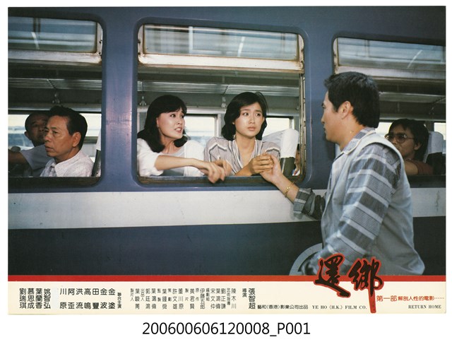 1. 臺灣社會寫實片《還鄉》中文橫式彩色宣傳劇照組圖。劇照設計為下方以紅線條隔出演職員表資訊區,以紅色描邊的黑色片名標準字在右下角跨在線上,右邊有「第一部解剖人性的電影......」紅色字樣,以及英文片名。劇照採滿版設計,場景為車站月台,一名男子(慕思成)與兩名女子(葉蘭香、劉瑞琪)隔著火車窗戶送別。火車似乎已經開動。劇照狀況良好。2. 《還鄉》為藝和(香港)影業公司於1989年出品的社會寫實片,由張智超導演,宋文仲、葉鴻偉、劉正謙編劇,陳木川武術指導,主要演員有慕思成、劉瑞琪、葉蘭香、洪流。本片由台聖公司發行的DVD將編劇誤植為呂繼尚。本片又名《街坊老角頭》。