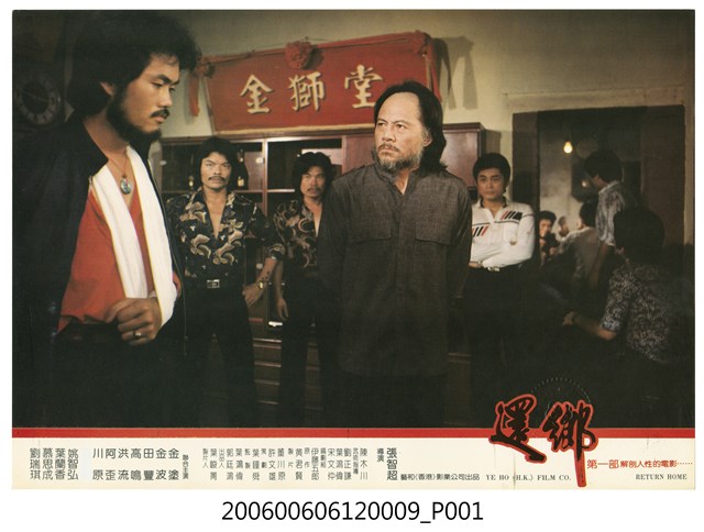 1. 臺灣社會寫實片《還鄉》中文橫式彩色宣傳劇照組圖。劇照設計為下方以紅線條隔出演職員表資訊區,以紅色描邊的黑色片名標準字在右下角跨在線上,右邊有「第一部解剖人性的電影......」紅色字樣,以及英文片名。劇照採滿版設計,場景為一客廳,牆上掛有「金獅堂」匾額。一名老者(高鳴)斥責一名左手骨折的年輕人。老者後方站著數位看起像是幫派份子的年輕人。劇照狀況良好。2. 《還鄉》為藝和(香港)影業公司於1989年出品的社會寫實片,由張智超導演,宋文仲、葉鴻偉、劉正謙編劇,陳木川武術指導,主要演員有慕思成、劉瑞琪、葉蘭香、洪流。本片由台聖公司發行的DVD將編劇誤植為呂繼尚。本片又名《街坊老角頭》。