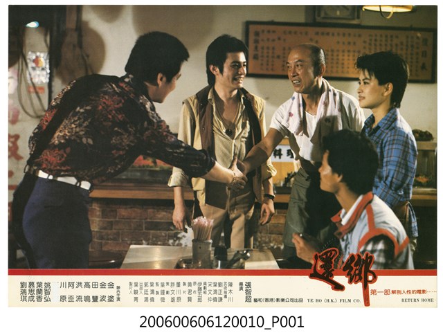1. 臺灣社會寫實片《還鄉》中文橫式彩色宣傳劇照組圖。劇照設計為下方以紅線條隔出演職員表資訊區,以紅色描邊的黑色片名標準字在右下角跨在線上,右邊有「第一部解剖人性的電影......」紅色字樣,以及英文片名。劇照採滿版設計,場景為一麵店,老闆(洪流)與一位男子握手,看似感謝對方。另有一位女子與兩名男子在旁。劇照狀況良好。2. 《還鄉》為藝和(香港)影業公司於1989年出品的社會寫實片,由張智超導演,宋文仲、葉鴻偉、劉正謙編劇,陳木川武術指導,主要演員有慕思成、劉瑞琪、葉蘭香、洪流。本片由台聖公司發行的DVD將編劇誤植為呂繼尚。本片又名《街坊老角頭》。