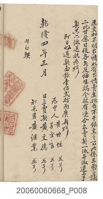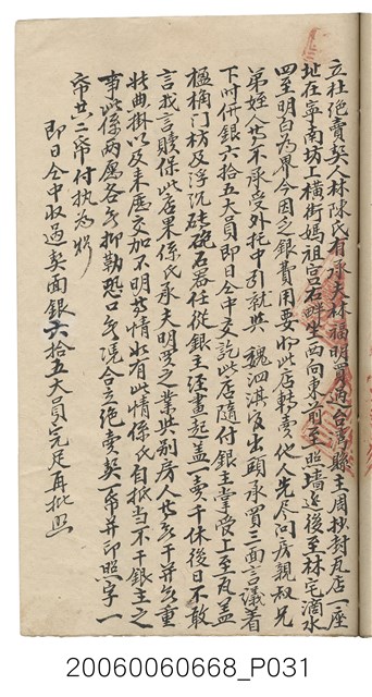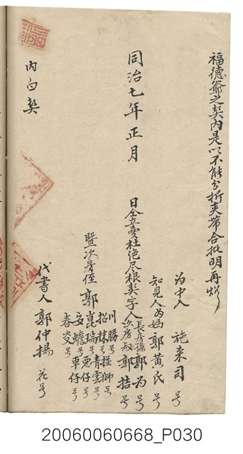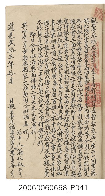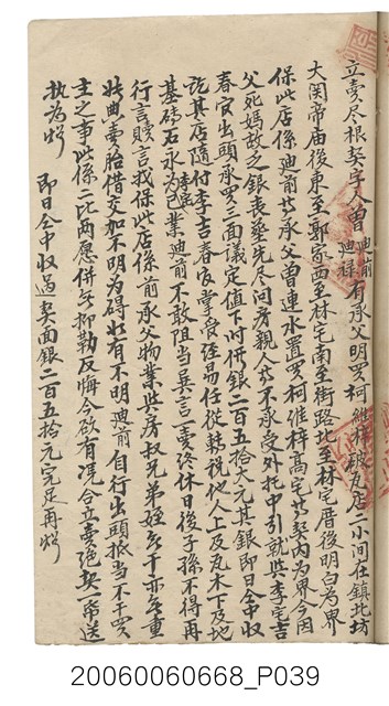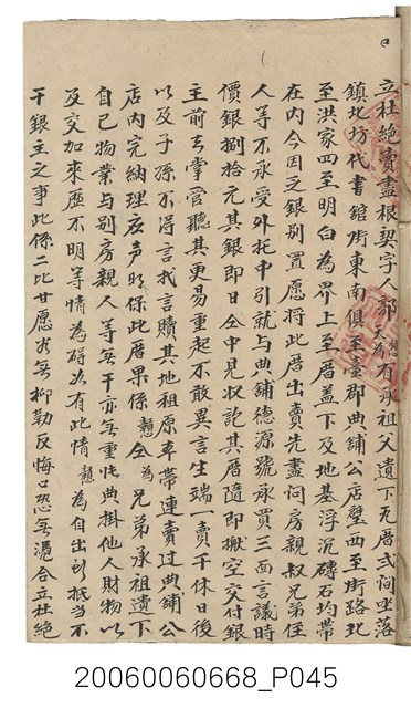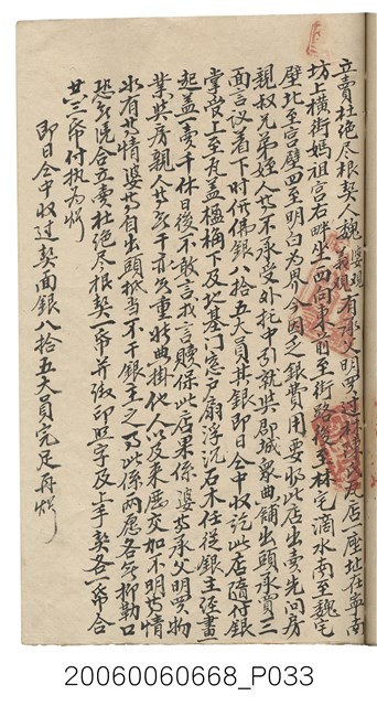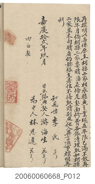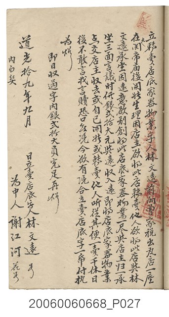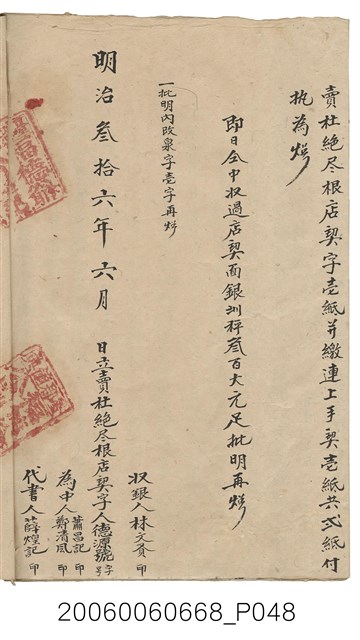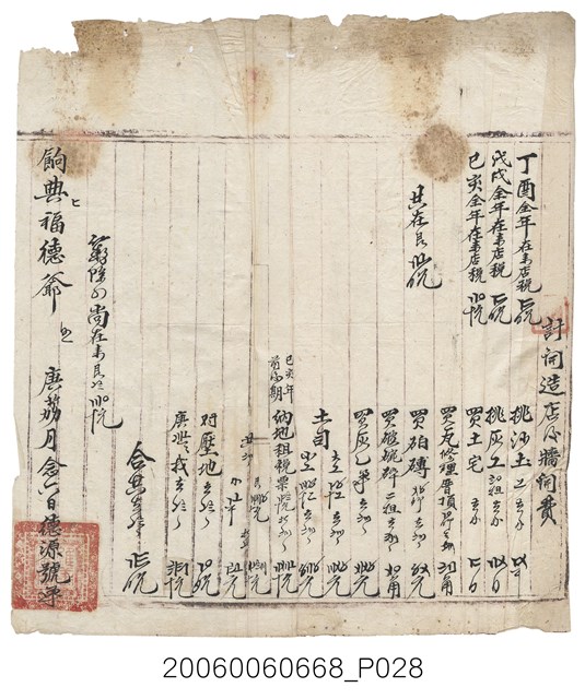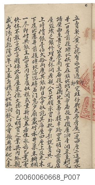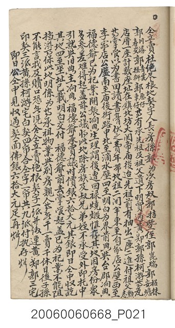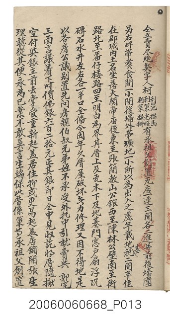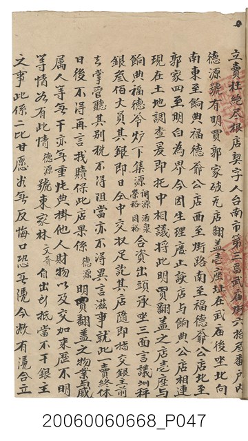 本件屬於福德爺承管的店屋契抄,內容共21筆抄契。1. 雍正11年8月黃瑞甫立賣契2. 雍正12年6月鄭奇、鄭碧立賣契3. 乾隆4年3月黃文德立賣契4. 乾隆40年12月孫爾陽立轉典契5. 嘉慶10年1月柯利筂、利策、利萊、掽馬、光昭、掽獅仝立賣盡絕契6. 嘉慶12年9月游海生立轉典契7. 嘉慶12年3月柯維梓立找絕賣盡根契8. 嘉慶12年8月柯老使立賣契9. 道光3年7月林陳氏立杜絕賣契10. 道光8年3月魏婆、魏義立賣杜絕盡根契11. 道光10年6月仕簠、光庭立合同字12. 道光13年3月石蓮池立賣杜絕盡根契13. 道光15年閏6月郭勳立典契14. 道光19年9月林文遠立轉賣店底家器物業字15. 道光19年9月曾迪前、曾迪祿立賣盡根契16. 道光23年10月李吉春立賣盡根店契17. 道光24年4月郭立志立典契字18. 同治7年1月郭為、郭拮、郭崑瑞、郭招抹、郭安蟾、郭川勝、郭春炎、郭青雲、郭掽獅、郭惡仔、郭車仔仝立杜絕盡根地契字19. 同治7年1月郭為、郭拮、郭崑瑞、郭招抹、郭安蟾、郭川勝、郭春炎、郭青雲、郭掽獅、郭惡仔、郭車仔仝立杜絕盡根契字20. 同治12年1月郭憨、郭天為立杜絕賣盡根契21. 明治36年6月典舖德源號立賣杜絕盡根店契