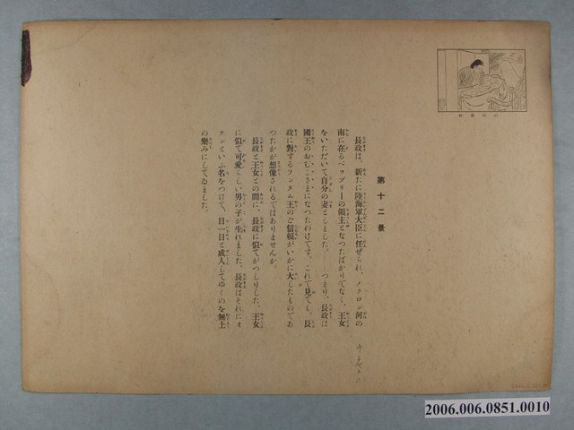 1.本物件為臺灣紙芝居協會表紙:紙芝居《リゴール総督・山田長政》第11景,為以「山田長政」為主角的彩繪印刷紙芝居。正面描繪的是第11幕的場景,為山田長政帶領著部隊迎擊呂宋的軍隊,畫面右方為長政一方的黃色船艦,左方則為呂宋的紅色船艦,右下角有數字「11」標示。背面的文字是第12幕的內容,講述的是長政成為新任陸海軍大臣,以及美功河以南的碧武里府的領主,並取公主為妻,生下了一名男孩,並取名為「オクン」,期待他早日長大成人。上面有鉛筆筆跡,可能為說書時的註釋。右上角則是後一幕的縮圖。