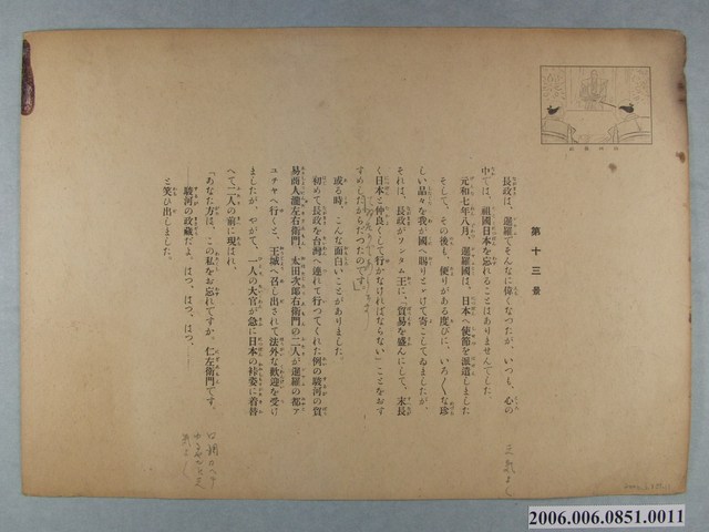 1.本物件為臺灣紙芝居協會表紙:紙芝居《リゴール総督・山田長政》第12景,為以「山田長政」為主角的彩繪印刷紙芝居。正面描繪的是第12幕的場景,為山田長政與妻子兒子一家三口,右邊是暹羅國的公主、左邊是已成為陸海軍大臣與領主的山田長政,中間的嬰兒是他們的兒子「オクン」,右下角有數字「12」標示。背面的文字是第13幕的內容,講述的是長政雖然在暹羅事業有成,但仍心懷祖國,在西元1621年8月,派遣使節前往日本,送去了許多珍稀的物品,並鼓勵與日本貿易。而曾經帶著長政前往臺灣的商人瀧左右衛門與太田次郎右衛門,也在暹羅與長政見面了。上面有鉛筆筆跡,可能為說書時的註釋。右上角則是後一幕的縮圖。