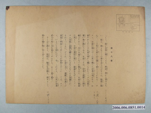 1.本物件為臺灣紙芝居協會表紙:紙芝居《リゴール総督・山田長政》第17景,為以「山田長政」為主角的彩繪印刷紙芝居。正面描繪的是第17幕的場景,為右腳負傷的山田長政,正在接受軍醫治療的景象,但軍醫實際上是由敵對大臣所派來的,手上的砂布則塗了毒藥,右下角有數字「17」標示。背面的文字是第18幕的內容,講述的是山田長政的遺言,對自己兒子オクン的期許:「擁有父親日本靈魂與母親暹羅王室血脈的他,具有重大的使命,維繫日本與暹羅的友好」,最後用短刀自盡。上面有鉛筆筆跡,可能為說書時的註釋。右上角則是後一幕的縮圖。