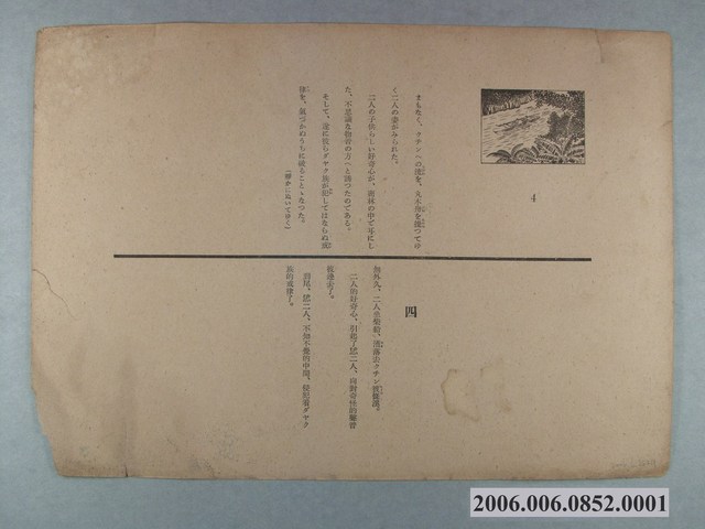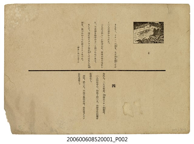 1.本物件為臺灣紙芝居協會表紙:《深山林內的日章旗》第三景,為講述ダヤク族(達雅族)的紙芝居故事。正面描繪的是第3幕的場景,達雅族的兩名年輕孩子坐在樹上吃著水果,並談論著什麼的景象,右下角頁碼缺失。背後文字是第4幕的內容,分為上下兩部分,上面是由日文書寫,下面則是用當時的臺灣話書寫。內容講述的是兩名達雅族的小孩因為好奇密林裡的聲音,於是乘著船順著河流而下,但卻沒注意到這個舉動觸犯了達雅族的戒律。右上角則是後一幕的縮圖。