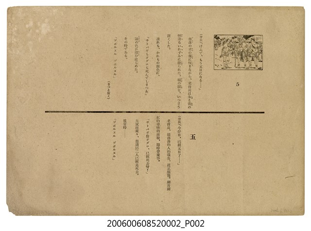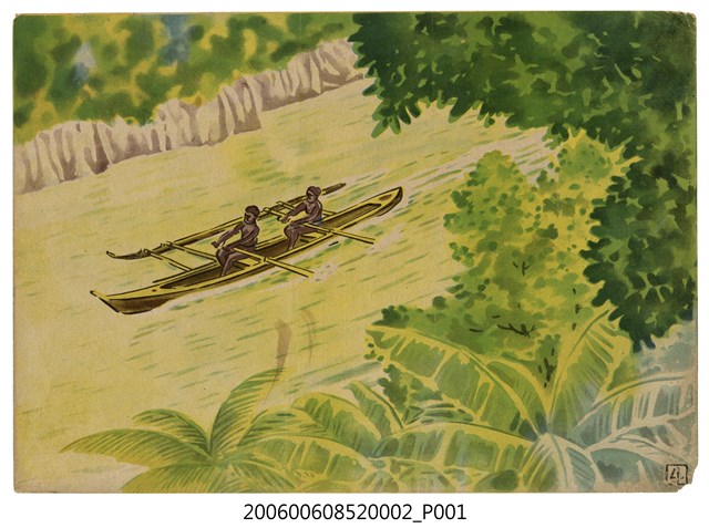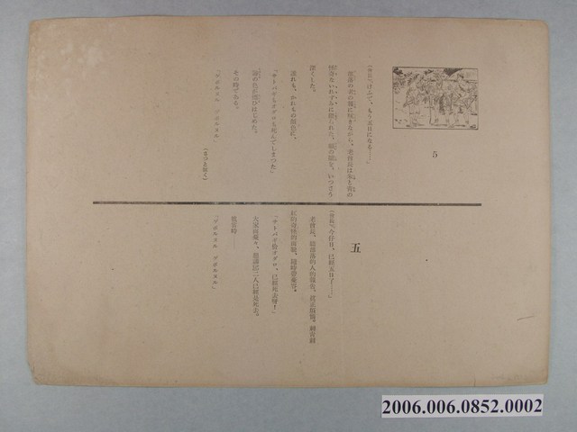 1.本物件為臺灣紙芝居協會表紙:《深山林內的日章旗》第4景,為講述ダヤク族(達雅族)的紙芝居故事。正面描繪的是第4幕的場景,兩名好奇的達雅族孩子乘著船,順著溪流前往密林找尋奇怪聲音的源頭,右下角有數字「4」標示。背後文字是第5幕的內容,分為上下兩部分,上面是由日文書寫,下面則是用當時的臺灣話書寫。內容講述的是部落眾人擔憂的認為失蹤5天的「サトパギ」與「オダロ」可能已經死了。右上角則是後一幕的縮圖。