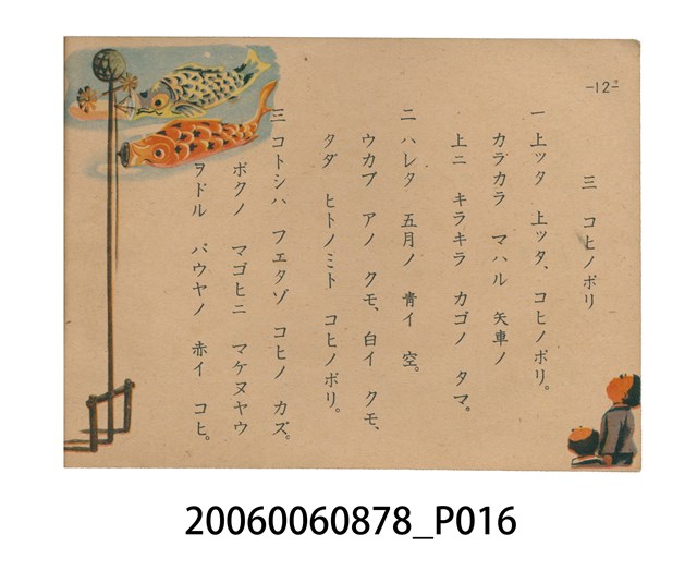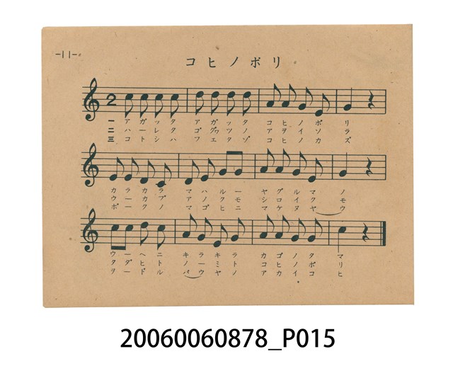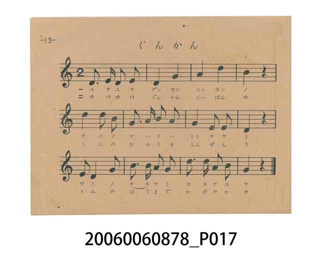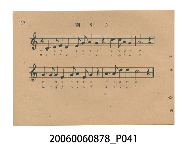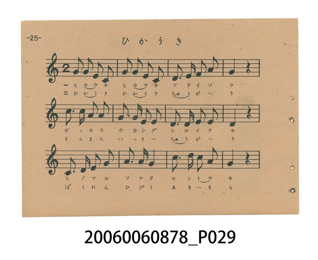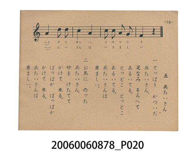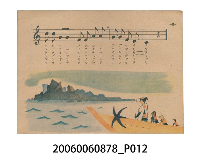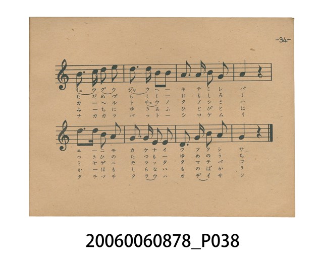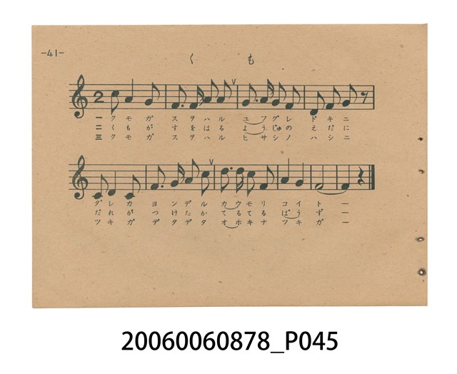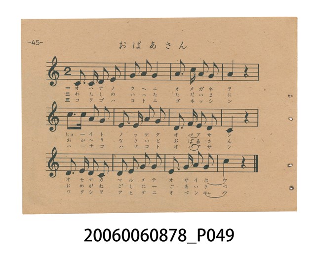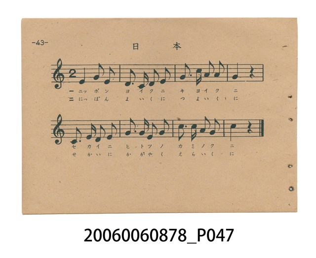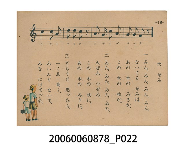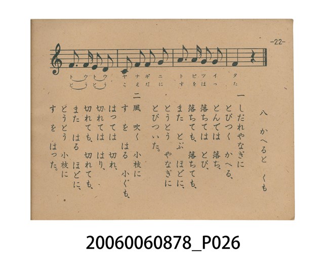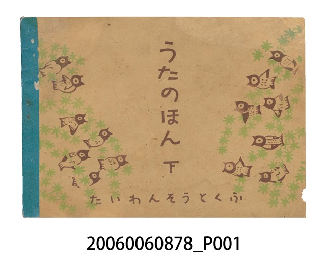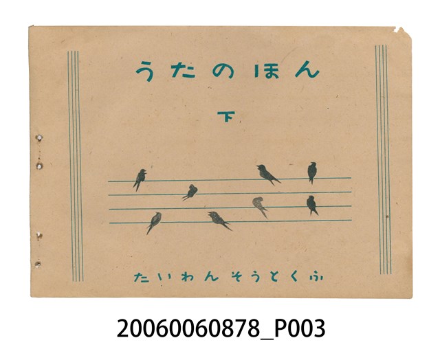 本件為臺灣總督府編纂、發行《うたのほん》(唱歌課本),冊次為下冊,彩色印刷,供國民學校第2學年(年級)兒童使用。發行時間為昭和18年(1943年)10月30日,由臺北精版印刷株式會社臺北工場發行。本教科書收入20首歌曲,附有簡譜,歌詞頁面印有彩圖。