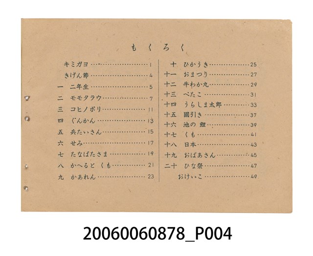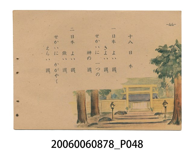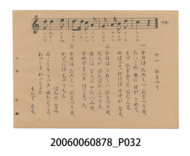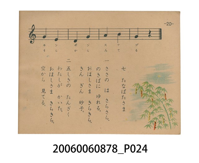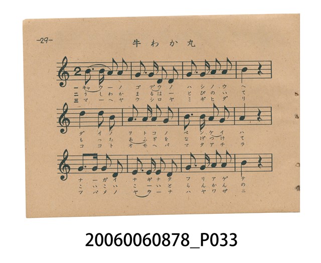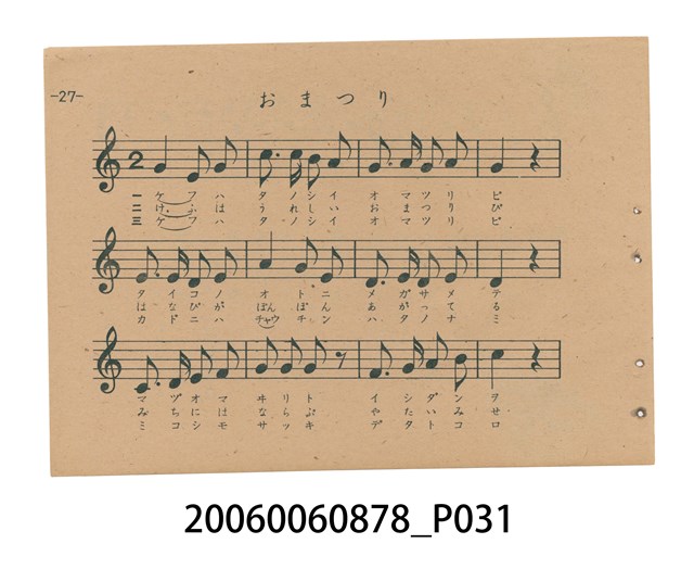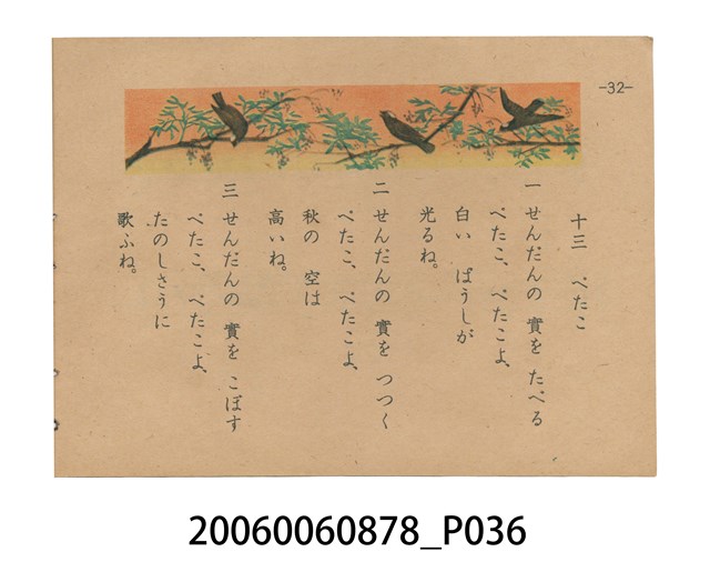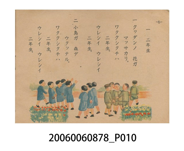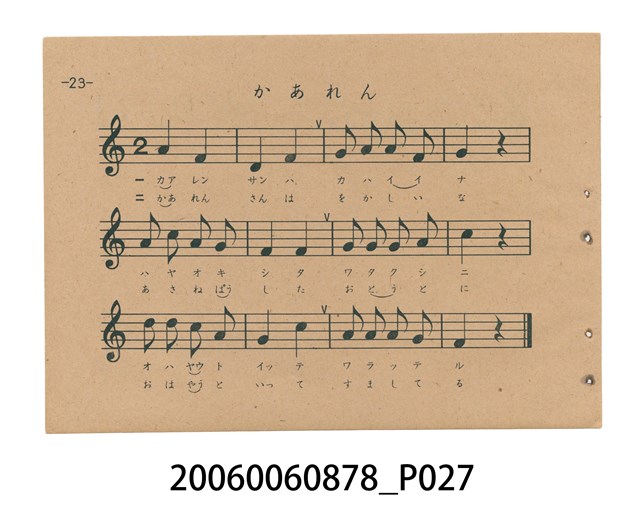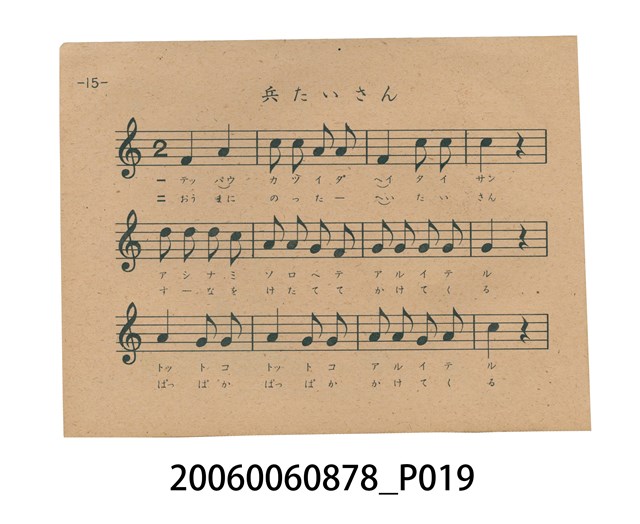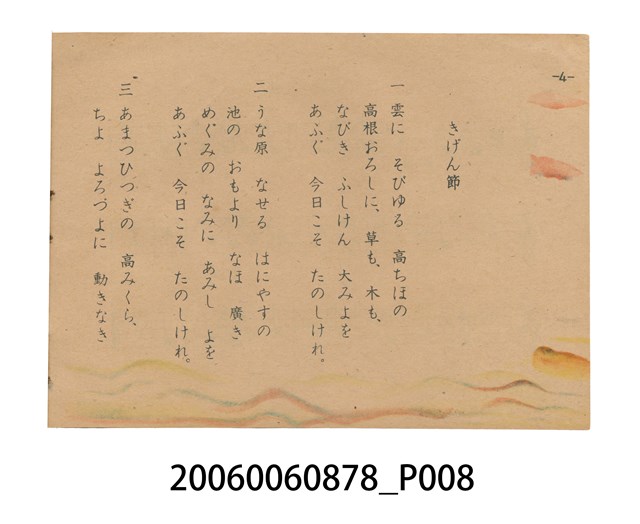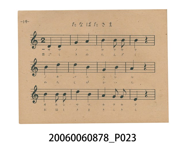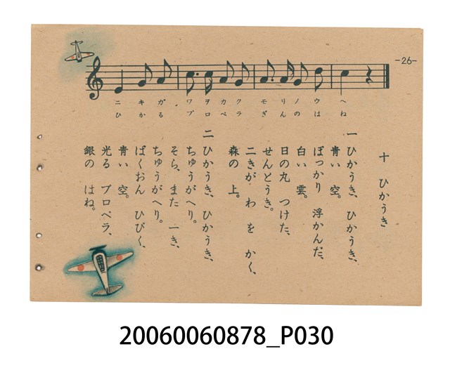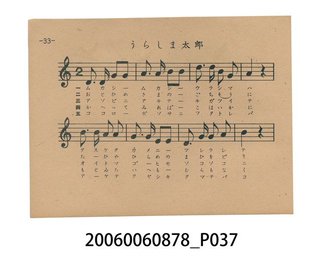 本件為臺灣總督府編纂、發行《うたのほん》(唱歌課本),冊次為下冊,彩色印刷,供國民學校第2學年(年級)兒童使用。發行時間為昭和18年(1943年)10月30日,由臺北精版印刷株式會社臺北工場發行。本教科書收入20首歌曲,附有簡譜,歌詞頁面印有彩圖。