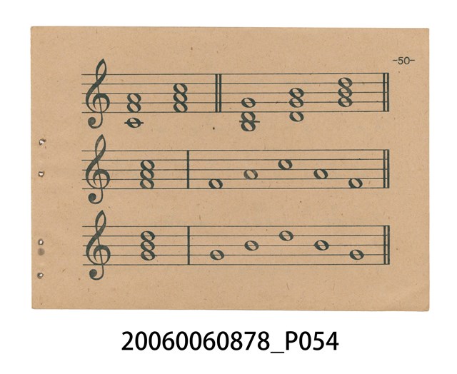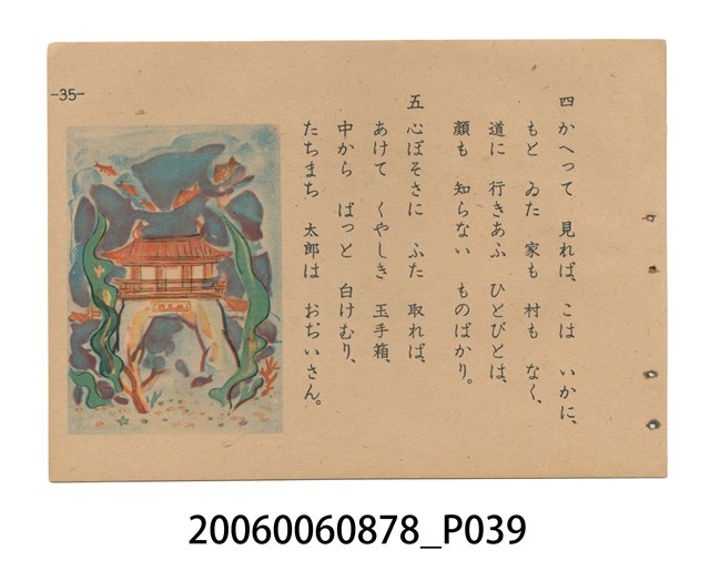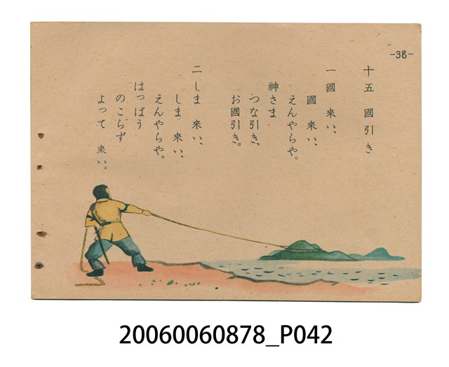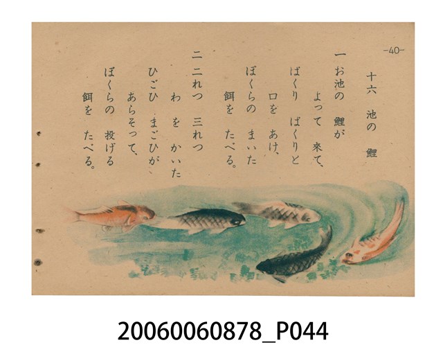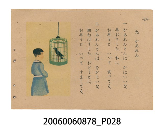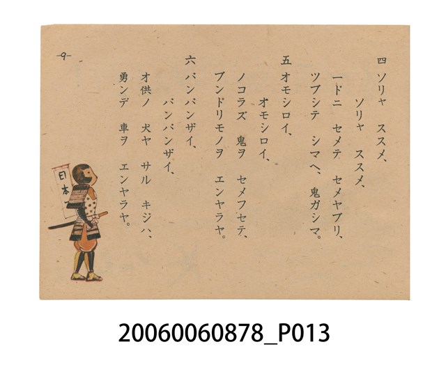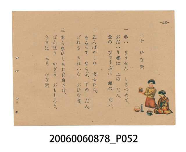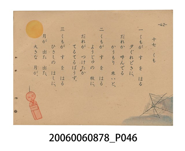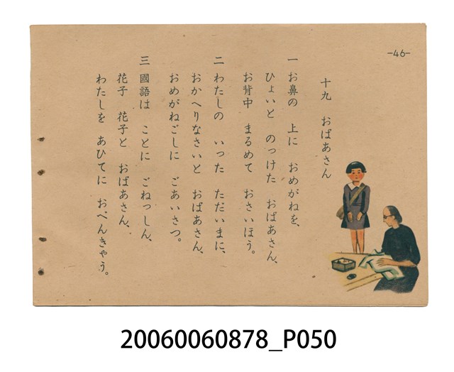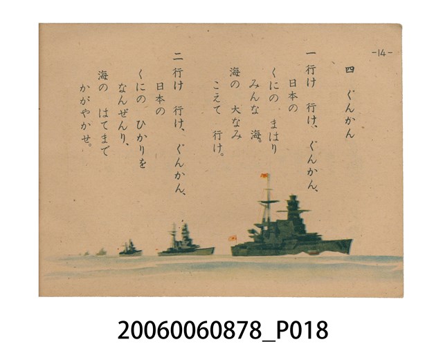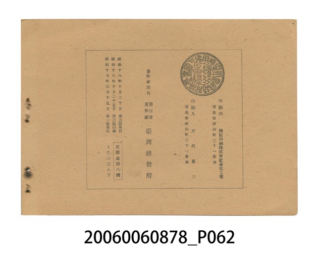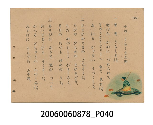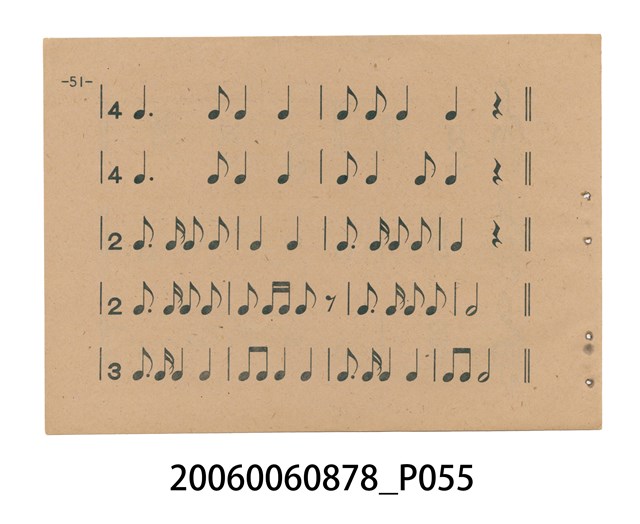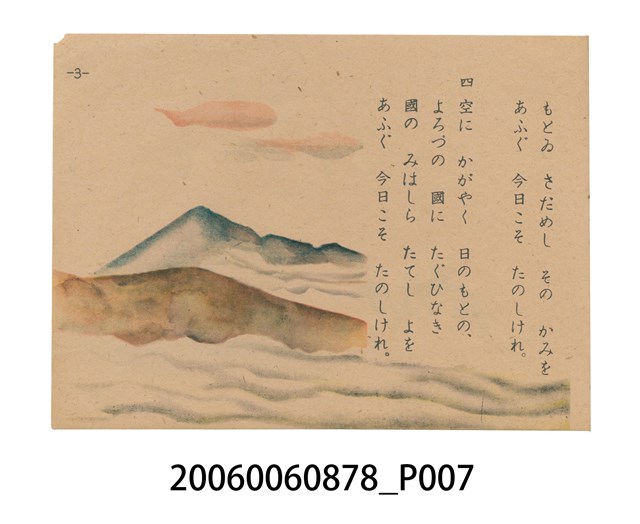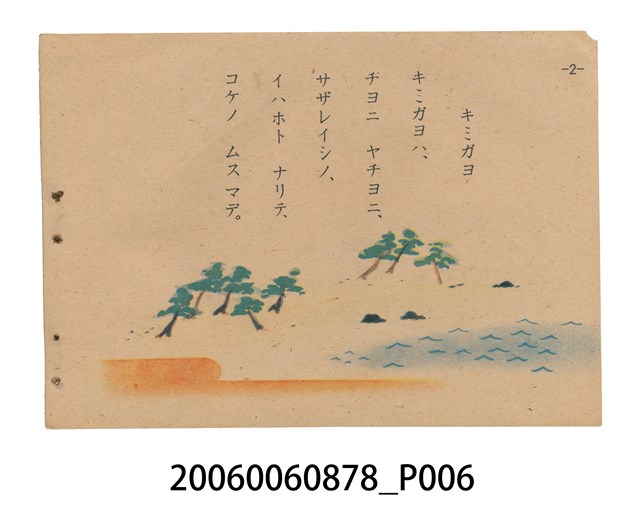 本件為臺灣總督府編纂、發行《うたのほん》(唱歌課本),冊次為下冊,彩色印刷,供國民學校第2學年(年級)兒童使用。發行時間為昭和18年(1943年)10月30日,由臺北精版印刷株式會社臺北工場發行。本教科書收入20首歌曲,附有簡譜,歌詞頁面印有彩圖。