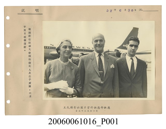 此物件為照片檔案,相片右上角列有日期(1963年6月30日)及編號,左側印有文字說明,下方註記相片來源。 此物件記錄了6月25日美國新任駐華大使賴特(Jerauld Wright)全家抵臺之場景。賴特為退役的美國海軍上將,曾參與一戰與二戰,並於1963年6月至1965年7月堅擔任美國駐臺大使。 此物件提到美國與中國國民黨政府政府外交上的關係,在1949年中國共產黨擊敗以國民黨政府後,美國杜魯門總統曾於1950年1月發表「袖手旁觀(hand-off)聲明」。而然而自1948年捷克共產黨的政變、1949年蘇聯的核子彈試爆成功、中國的共產化以及「麥卡錫主義」的推波助瀾,導致美國國內的反共情緒高漲,而在「韓戰」爆發後,決定遏止共產黨擴張的美國作出更直接的手段,即派出第七艦隊巡防臺灣,並提供國民黨政府經濟、軍事上的援助。1960年代,蘇聯與中國共產黨的關係交惡,美國政府為拉攏中共而轉與中華人民共和國建交,並邀其加入聯合國。對此,國民黨政府選擇退出聯合國以示抗議。