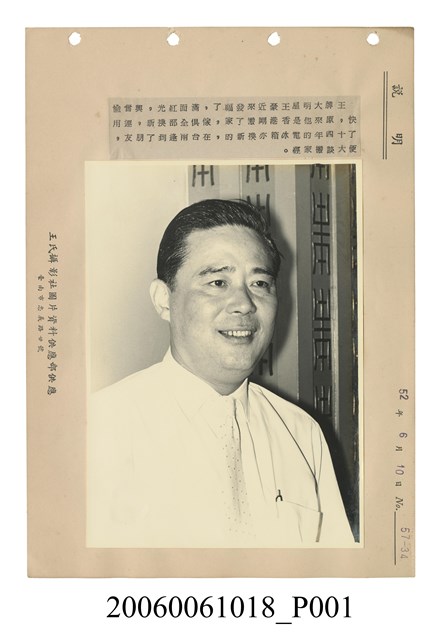 1.新聞照片剪貼,橫式版型,為活頁孔裝訂形式,頁面印有「說明」、「年月日no.」、「王氏攝影社圖片資料供應部」、「臺南市忠義路廿號」字樣,日期52年6月10日No.57-34為手寫,黑白新聞照片和說明文字為剪貼黏上。畫面主要呈現王豪露齒微笑的半身特寫。2.「王牌大明星王豪發福」推估是1963年6月4日香港電影《諜海四壯士》至臺南拍攝外景時期所攝。
