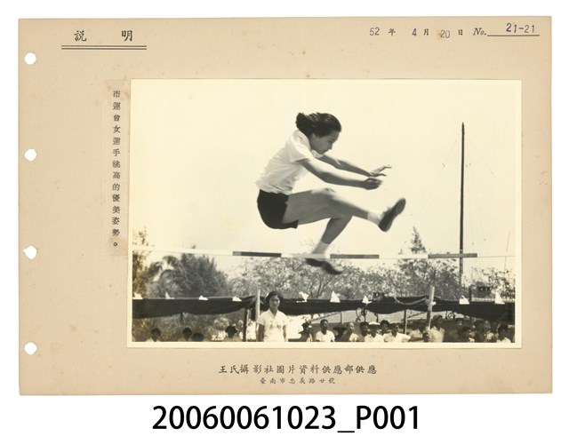 本物件為照片市運會女選手跳高的優美姿勢,照片中為跳高選手躍起,跳過橫桿的一瞬間,照片貼於紙卡中央,紙卡左側有四個穿孔可收集成冊,左上有「說明」黑色字樣,照片左方黏貼一張紙條書寫「市運會女選手跳高的優美姿勢」字樣,右上以印刷及蓋章方式書寫「52年4月20日 No. 21-21 」字樣,下方有「王氏攝影社圖片資料供應部供應 臺南市忠義路廿號字樣」黑色字樣。