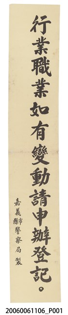 本件嘉義縣市警察局製「行業職業如有變動請申辦登記。」的直式長方形標語為白紙黑字印刷,中間有摺痕,紙張泛黃,大致保存良好。