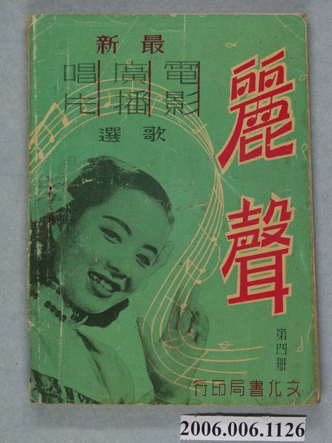 本物件為麗聲歌集第四冊,紙質文物。物件正面整體以綠色為設計,可見「麗聲第四冊」、「最新電影廣播唱片歌選」、「文化書局印行」字樣。物件內頁可見「麗聲歌選廣播目次」,其歌選包括「國歌」、「小白菜」、「思想山歌」…等。物件封底可見「最新流行歌集 附金色夜叉主題歌」、「中華民國四十四年出版」、「麗聲 4」、「驅逐俄寇 光復中華」字樣。