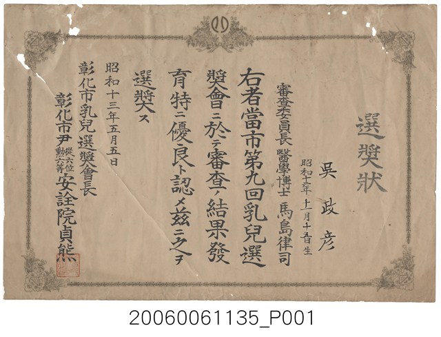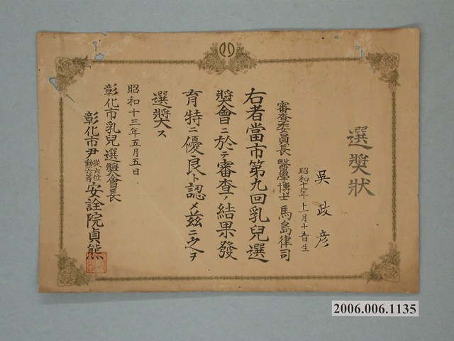2006.006.1135 昭和13年彰化市乳兒選獎狀