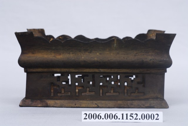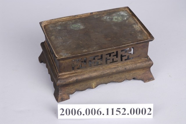 本件銅製臺座為銅製香爐的臺座,具有四足,座臺部分以鏤雕方式雕刻卍字紋裝飾。