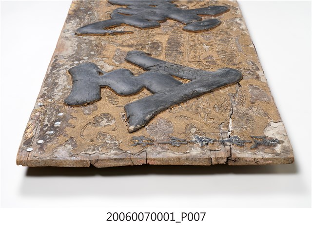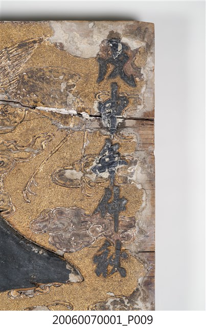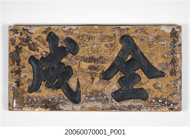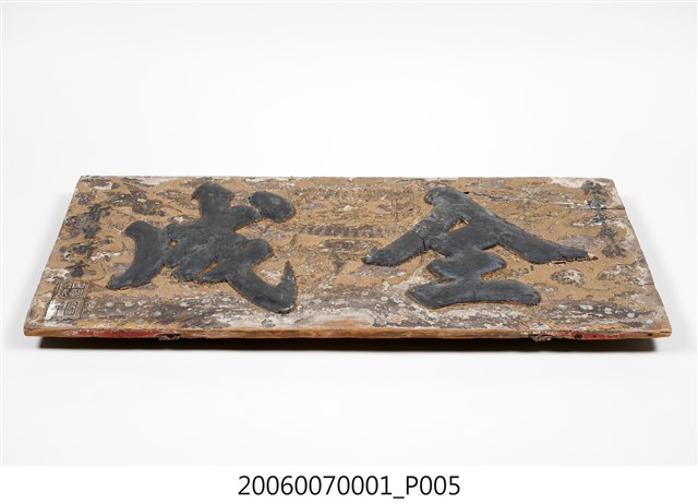 2.匾額正面通體上金漆,文字則為黑色墨書,表面有淺浮雕,中央為樓台、靈芝、香爐之吉祥主題,下方為海浪紋,左右則有雲朵與仙鶴,整體給人華麗富貴之感。
