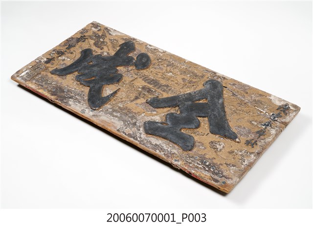 1.本件為明治41年郭曾炘書「全成」木製匾額,此匾額上款「戊申年仲秋」,中央匾詞為「全成」二字,下款「郭曾炘書」,下方刻有二印,上印為「臣曾炘章」,下印為「圖章」。整體以4塊長形木板拼接而成,背面有2長木條固定。