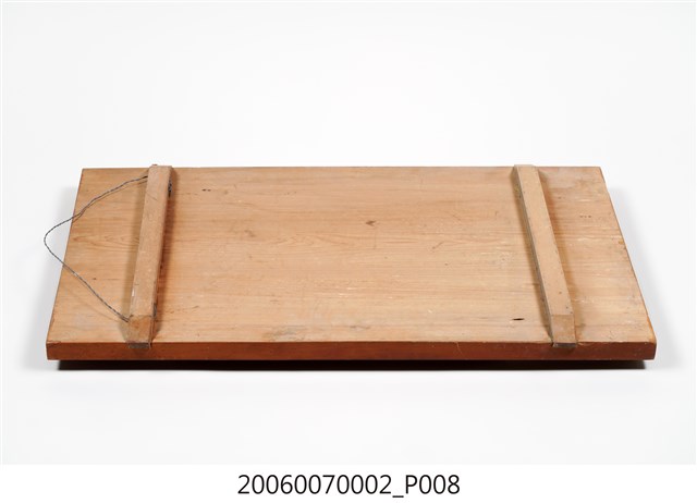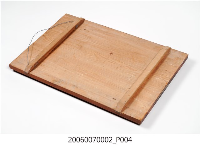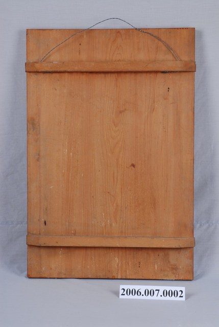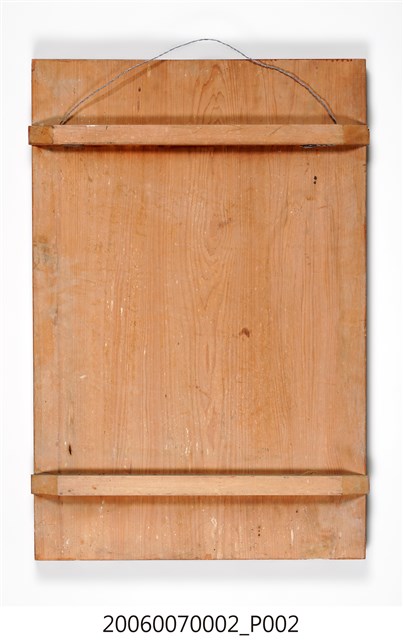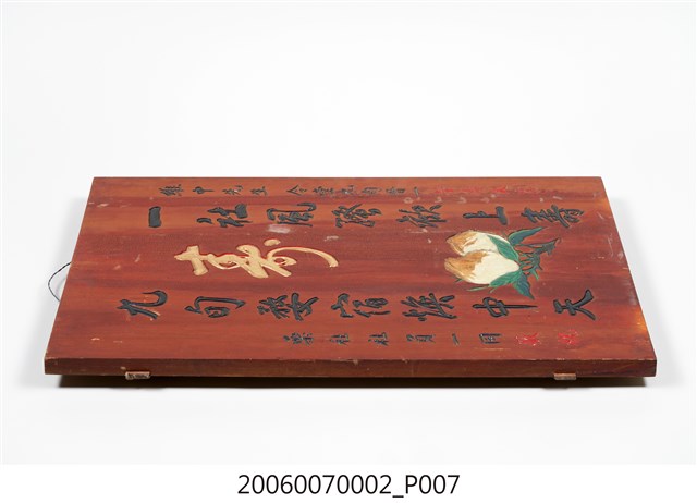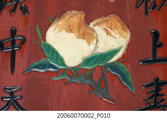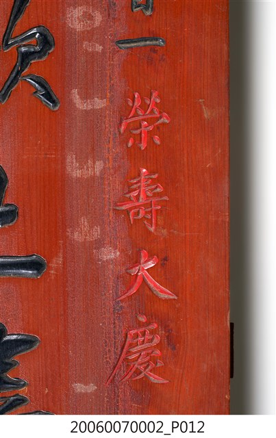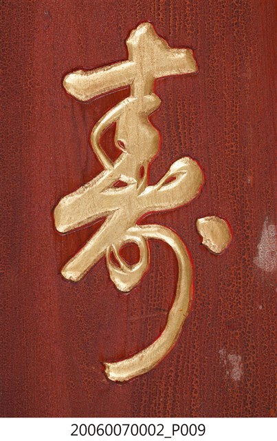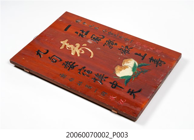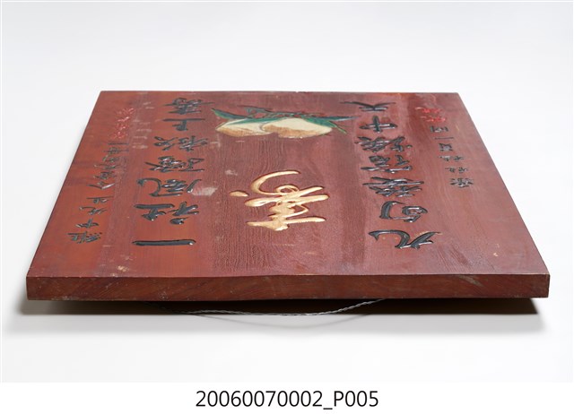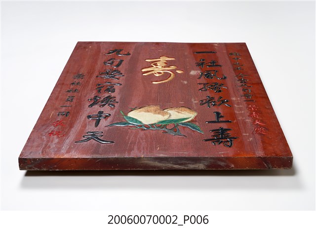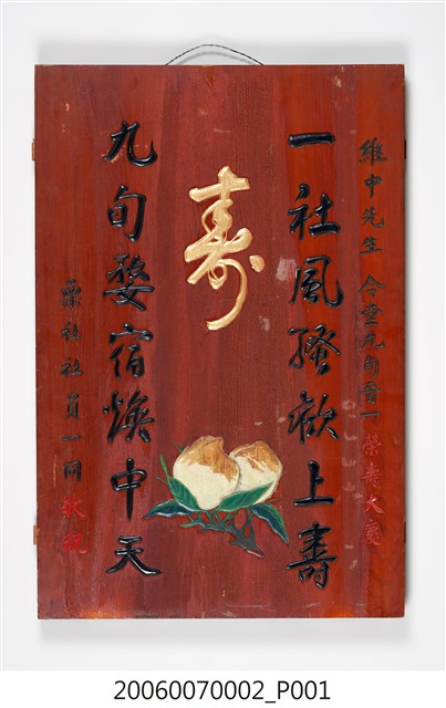 1.本件為苗栗栗社詩人祝壽木匾,此匾額形式較為特殊,上款「維中先生令堂九旬晉一榮壽大慶」,下款「栗社社員一同敬祝」。中間的對聯上聯為「一社風騷歡上壽」,下聯「九旬婺宿煥中天」,對聯中夾有金色草書之壽字與兩個填彩連枝壽桃。匾額整體為一塊木板製成,背後有兩個橫向木條用以固定。僅正面上清漆,背部不上漆。