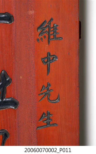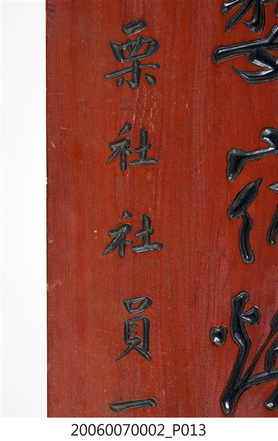 2.此匾為栗社祝賀維中先生父親91歲生日的賀匾,栗社於昭和2年(1927)在苗栗後龍英才書院成立,前身為天香吟社,成員包括苗栗地區重要文人,如李祥甫、吳濁流等。日治因殖民對於詩文之審查,故創作上以傳統吟詠為主,戰後則有吳濁流等漢詩現代化的主張,為當時苗栗地區最具有地方特色與影響力之藝文團體。
