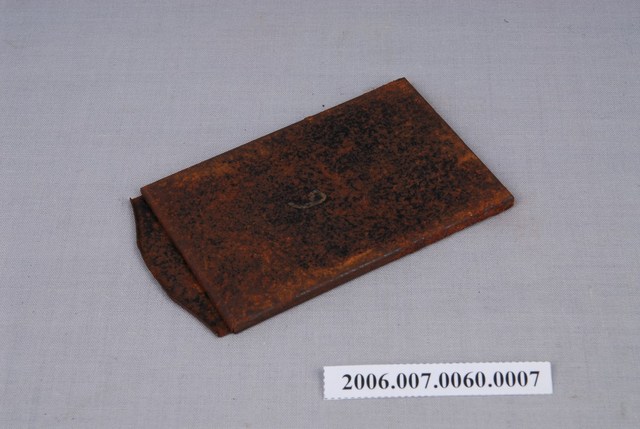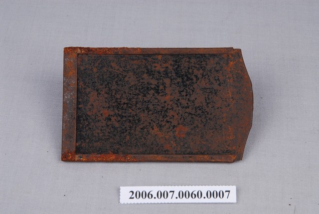 本件藏品是一個金屬片匣,是館藏編號「2006.007.0060」玻璃底片相機組中的組件之一。片匣尺寸8.1cmx4.9cmx0.4cm,可放置3吋大小玻璃底片或聚酯軟片。匣身金屬多處斑駁鏽蝕,片匣上有後來手寫上的數字「6」,由於該組件中共有11張同款片匣,標示為套組第6張片匣,以便拍照時識別避免誤用。片夾上沒有廠牌,推測是市場上的現成品。