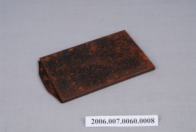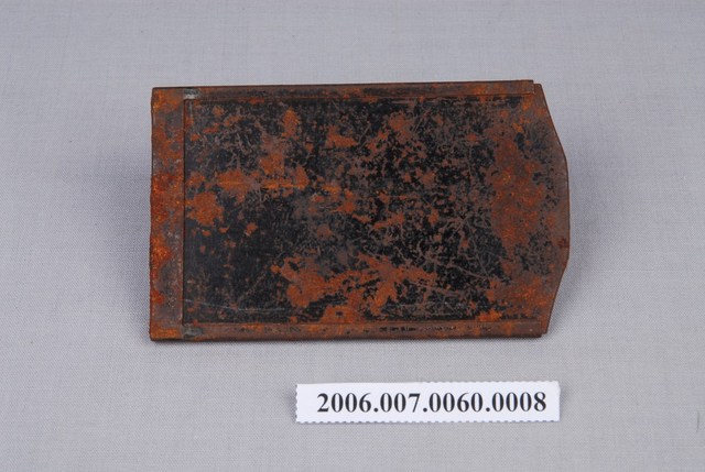 本件藏品是一個金屬片匣,是館藏編號「2006.007.0060」玻璃底片相機組中的組件之一。片匣尺寸7.9cmx4.9cmx0.4cm,可放置3吋大小玻璃底片或聚酯軟片。匣身金屬多處斑駁鏽蝕,片匣上有後來手寫上的數字「3」,由於該組件中共有11張同款片匣,標示為套組第3張片匣,以便拍照時識別避免誤用。片夾上沒有廠牌,推測是市場上的現成品。