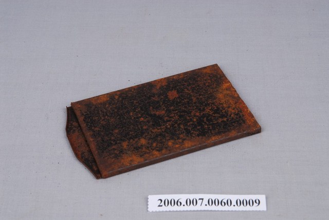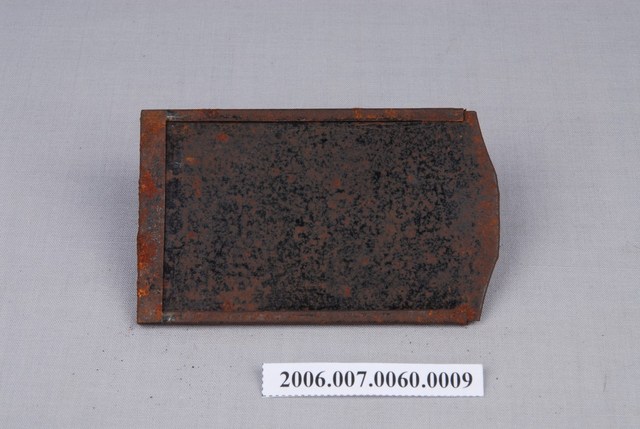 本件藏品是一個金屬片匣,是館藏編號「2006.007.0060」玻璃底片相機組中的組件之一。片匣尺寸8cmx4.9cmx0.4cm,可放置3吋大小玻璃底片或聚酯軟片。匣身金屬多處斑駁鏽蝕,片匣上有後來手寫上的數字「5」,由於該組件中共有11張同款片匣,標示為套組第5張片匣,以便拍照時識別避免誤用。片夾上沒有廠牌,推測是市場上的現成品。