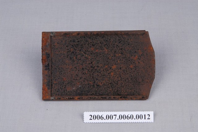 本件藏品是一個金屬片匣,是館藏編號「2006.007.0060」玻璃底片相機組中的組件之一。片匣尺寸7.9cmx4.9cmx0.4cm,可放置3吋大小玻璃底片或聚酯軟片。匣身金屬多處斑駁鏽蝕,片匣上有後來手寫上的數字「9」,由於該組件中共有11張同款片匣,標示為套組第9張片匣,以便拍照時識別避免誤用。片夾上沒有廠牌,推測是市場上的現成品。