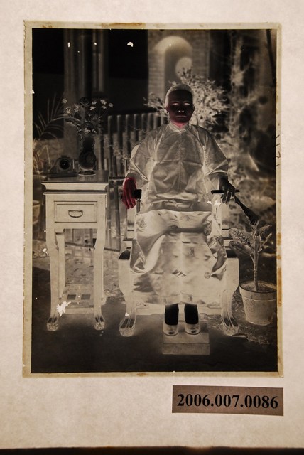1.這張玻板的藥膜面即是影像的反面,底片上下部份有變色的硫化銀反光,主畫面有一些剝落現象,側邊有手寫數字編號1516。人物的下巴與右手有加工塗紅,在印製照片時可以降低感光量以獲得額頭、左手、與腳部一致的明亮效果。2.影像中的主角為一名老婦人,坐於椅子上的全身照。婦人右邊道具為中式花几,上面放置花瓶及時鐘,花瓶上插上鮮花,左手邊放置盆花於地上。背景有欄杆,欄杆後面是住屋的門牆,場景為住宅院子。3.「塗紅」,玻板時代的感光乳劑對紅棕色感光力低,因此人臉或皮膚會顯得暗沉,為了還原底片中景物或人物的明暗度,進而發展出人工修整的技巧,就是在黑白底片上,將景物局部塗上紅墨水,再利用淡色的紅墨水塗層可以減少印製相片時的曝光量,因此得到白皙的皮膚效果,讓沖洗出的照片更加真實並美化,且能使景物更加立體。直至1960年代,都還有相館使用這種方法。