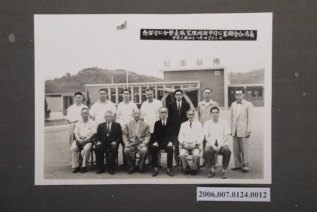 1.本物件為民國48年(1959)4月12日臺灣合會儲蓄公司中部經理駕臨東勢分公司紀念合影之黑白照片。照片地點為東勢車站,公司員工排成兩排,第1排採坐姿,第2排站立,照片上方列有文字「台灣合會儲蓄公司中部經理駕臨東勢分公司留念中華民國四十八年四月十二日」,載明拍照原因與日期。
